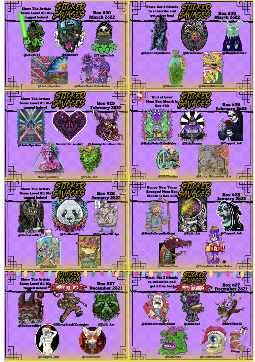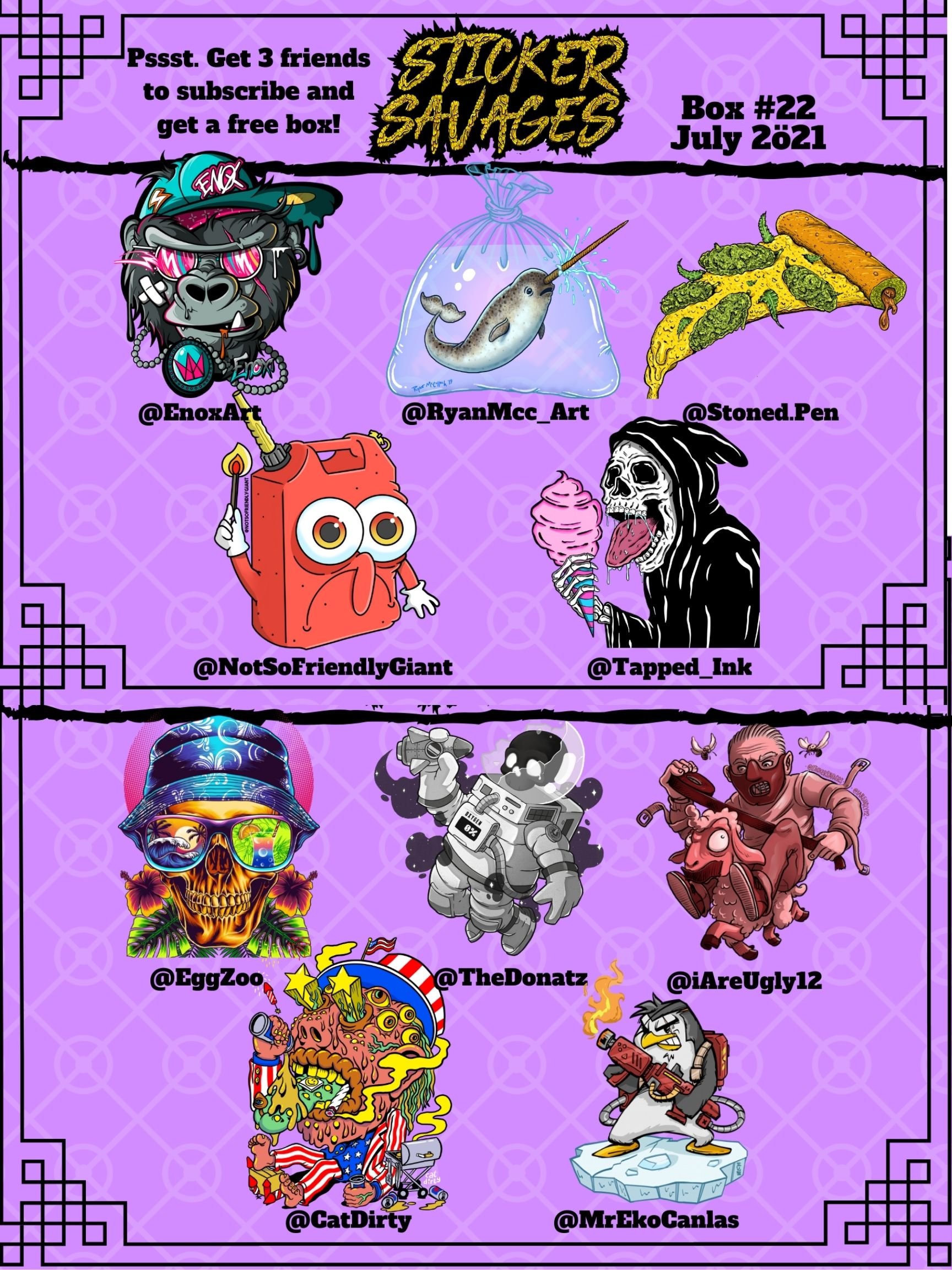 Sticker Savage Subscribers are mailed out 10 unique, exclusive stickers monthly. These stickers are all hand picked by our team from top artists on instagram from around the globe. Check out our previously released stickers below, and don't forget to subscribe today to not miss out on any future drops!